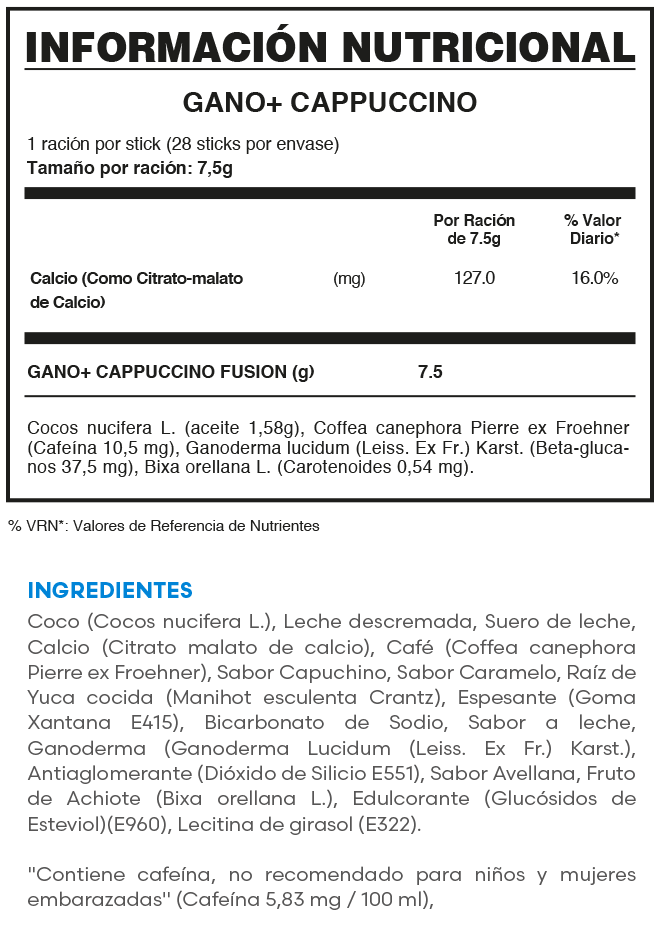 GANO+ CAPPUCCINO contiene aceite de coco, café (con 10.5 mg de cafeína), Ganoderma Lucidum (con 37.5 mg de beta-glucanos) y carotenoides (0.54 mg).